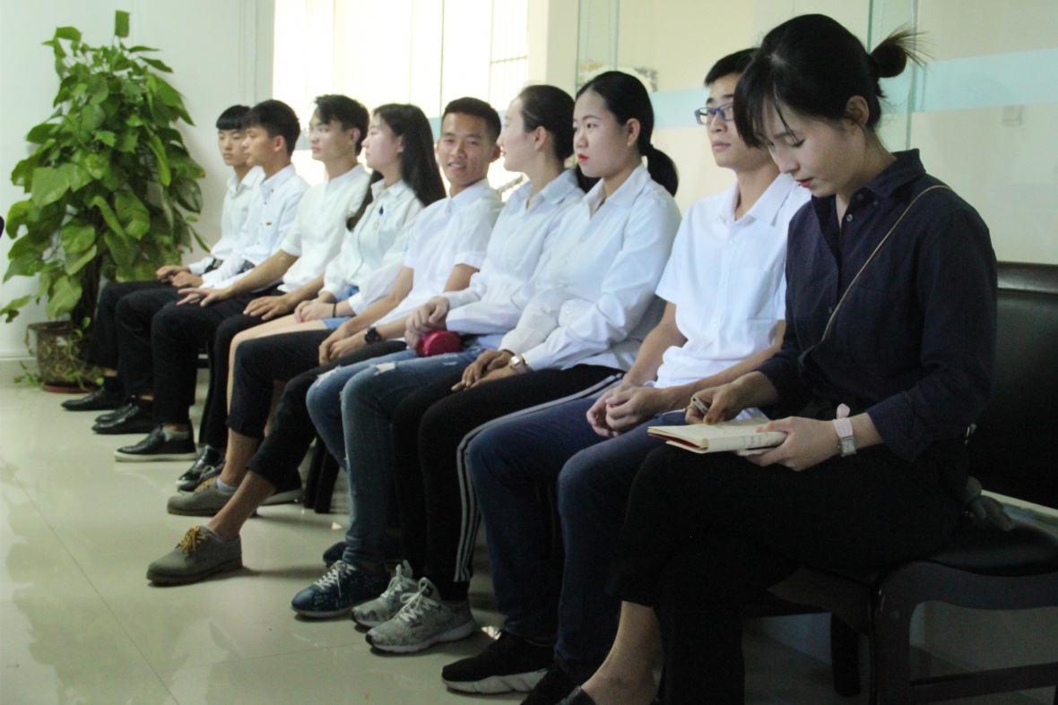 面试还没开始,参加面试的员工们就已早早来到了休息厅,每个人手里都拿着资料认真熟记在心,看得出他们十分重视此次面试。时间缓缓流逝,在面试开始前,余有勇老师按名单组织应聘同学有序在面试办公室门前排队等候。下午13时30分,面试准时开始,参加面试的同学按顺序进入,他们在电脑前正襟危坐,戴着耳机与面试官展开全英文的交流,认真回答面试官提出的问题。等待面试的员工们则坐在休息室互相讨论,为面试做足最充分的准备。