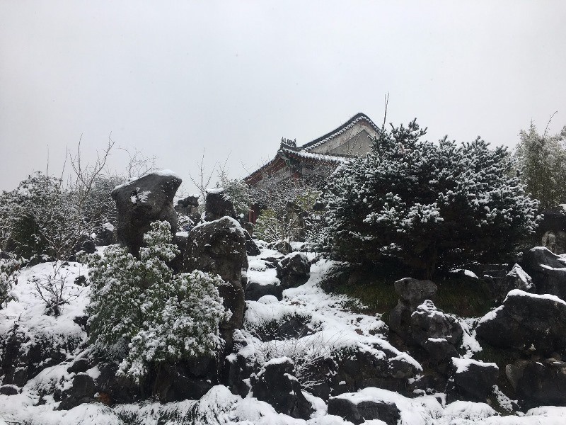一月的最后一天,我遇到了横店近几年最大的雪。南方的雪不像北方的雪那般坚硬,落在手上便化了。南方的雪也不像北方的雪那么多满地是雪,但仔细一看,还是会有一点一点的如星星搬耀眼的雪片。把脚踩上去,轻盈的雪花会随着脚的抬起一起缓缓的升起,又轻轻的落下。