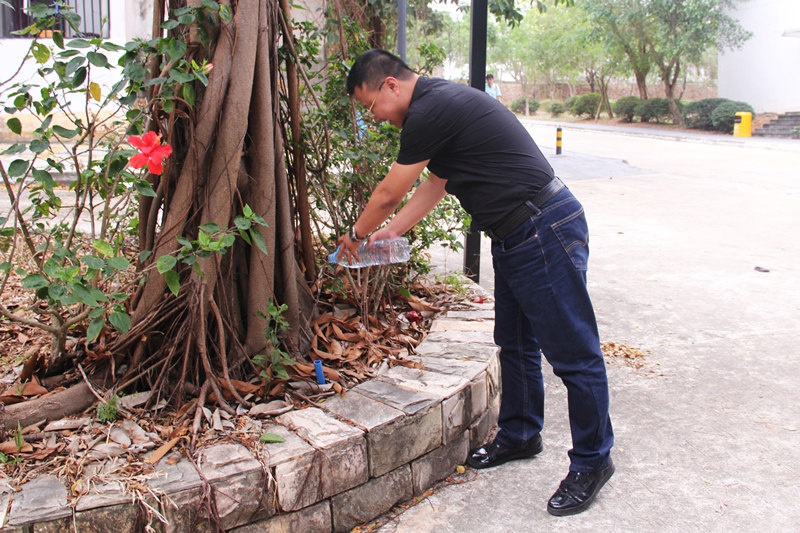王翔书记走到南区办公楼的五彩树旁,把画有卡通植物的卡片挂在了五彩树上,并拿起了身旁的矿泉水,仔细的浇在了树周围的泥土里。恰好微风拂过,绿色卡片随着树叶摇曳起来,可以清晰地看到王翔书记在卡片上写的“杨柳抽芽始于人,万物萌发源于春”的话语。在王翔书记良好的带头作用下,石玲老师、王曦茜老师、李湘婷老师也别出心裁的在卡片上写上了自己对保护绿色环境的愿望。并把写好的卡片挂在了五彩树旁周围的不同树上,拿起身旁的水浇在了树周围的泥土里。