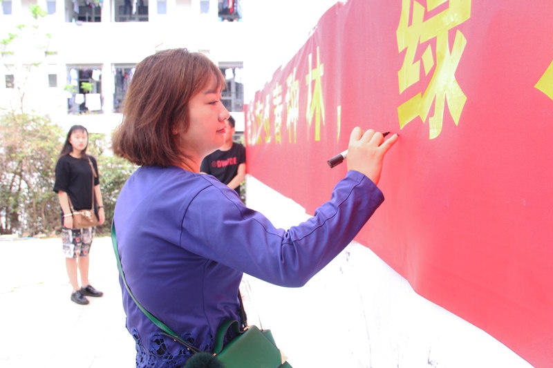 活动开始,王翔书记拿着笔在“活力旅业春种林,绿水长青学子福”的横幅上写下自己的名字,以带头作用宣示着自己对保 护环境的一份信心。紧接着石玲老师、王曦茜老师、李湘婷老师也纷纷在横幅上留下自己的名字,并与活动全体成员合影留念。