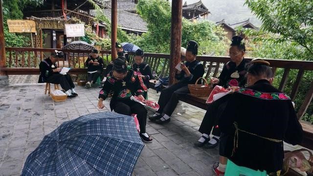 苗族大妈聚在一块儿做针线,有说有笑,但是她们说的话,我一句也听不懂。