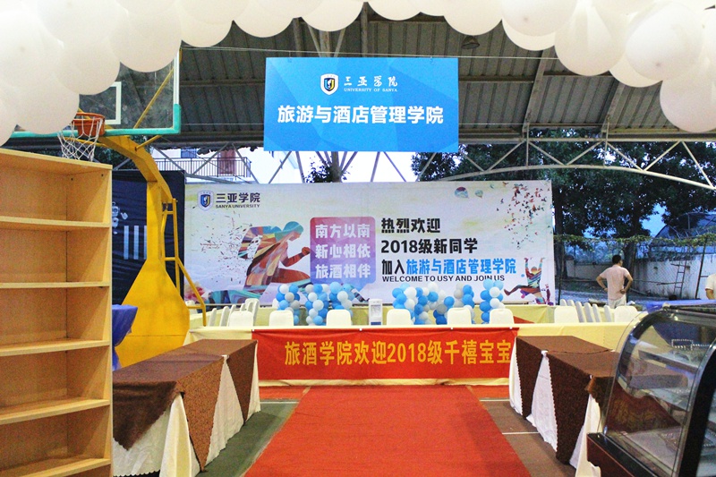 今年的迎新现场以公司邮轮专业为主题,场地装饰整体采用清新淡雅的颜色,两旁布置有邮轮模型及供展示的鸡尾酒,突出邮轮专业特色。迎新过程中的“导游引导新生报到”和“在这留下你的第一‘印’”活动也尤为吸睛。