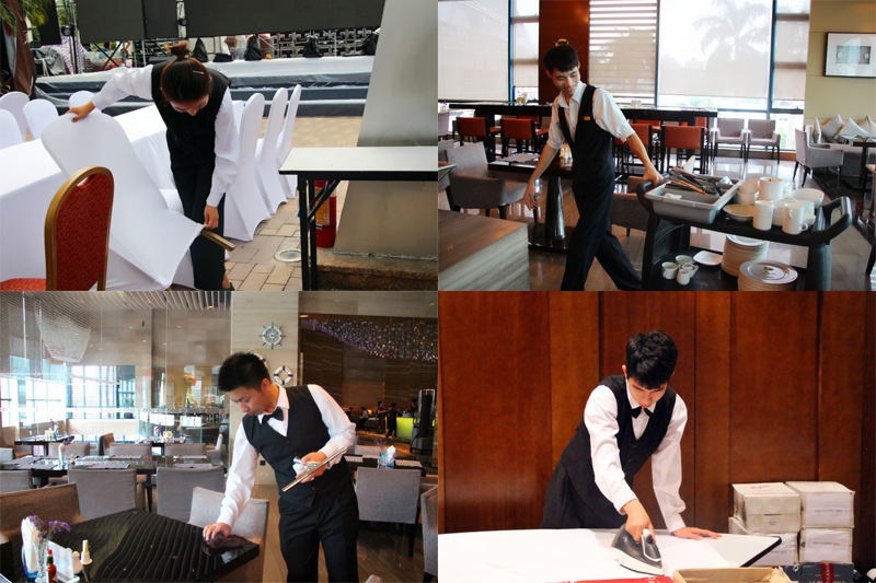 在志愿活动中,志愿者们被分配到销售部、西餐厅、前厅部、宴会厅、酒水部等各个部门。从7日晚上的媒体欢迎晚宴、8日的官方晚宴及宴后酒会,到9日的“王的盛筵”以及“展商之夜”酒会,会场上随处可见公司志愿者们忙碌的身影。无论是在哪个部门工作,志愿者们认真严谨的工作态度受到负责人的一致称赞。