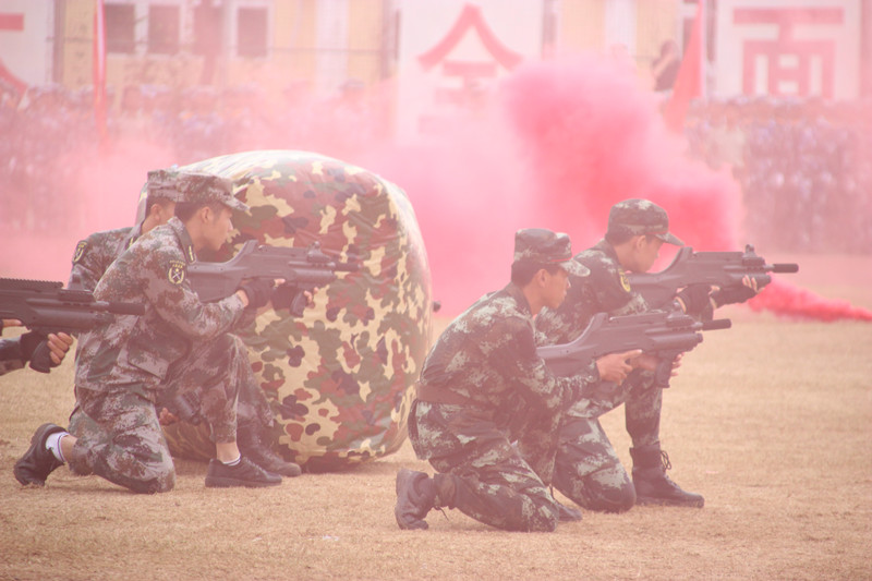 接下来是精彩绝伦的汇报表演。忽地,只看见操场上红烟滚滚,枪支弹药全上阵,杀敌救伤亦演全,精彩绝伦的表演看得观众热血沸腾。这,就是战场救护汇报表演;“哼!哼!哈!嘿!”随着挥舞的棍棒吼出,气势磅礴,展示英雄本色。这,就是应急棍项目表演;敌来我挡,敌守我攻,一招一式之间都透露出快准狠,这,就是擒敌术项目表演。之后教官员工齐跳“98K”,方队字表演结束后,此次大会完美落幕。