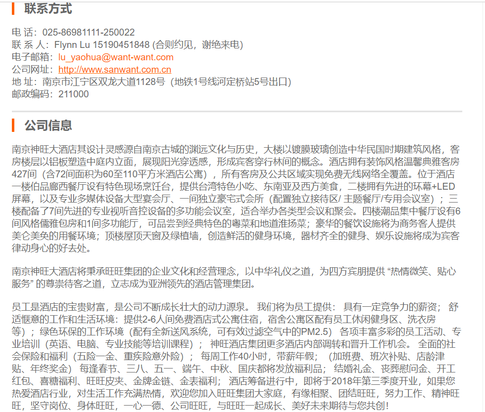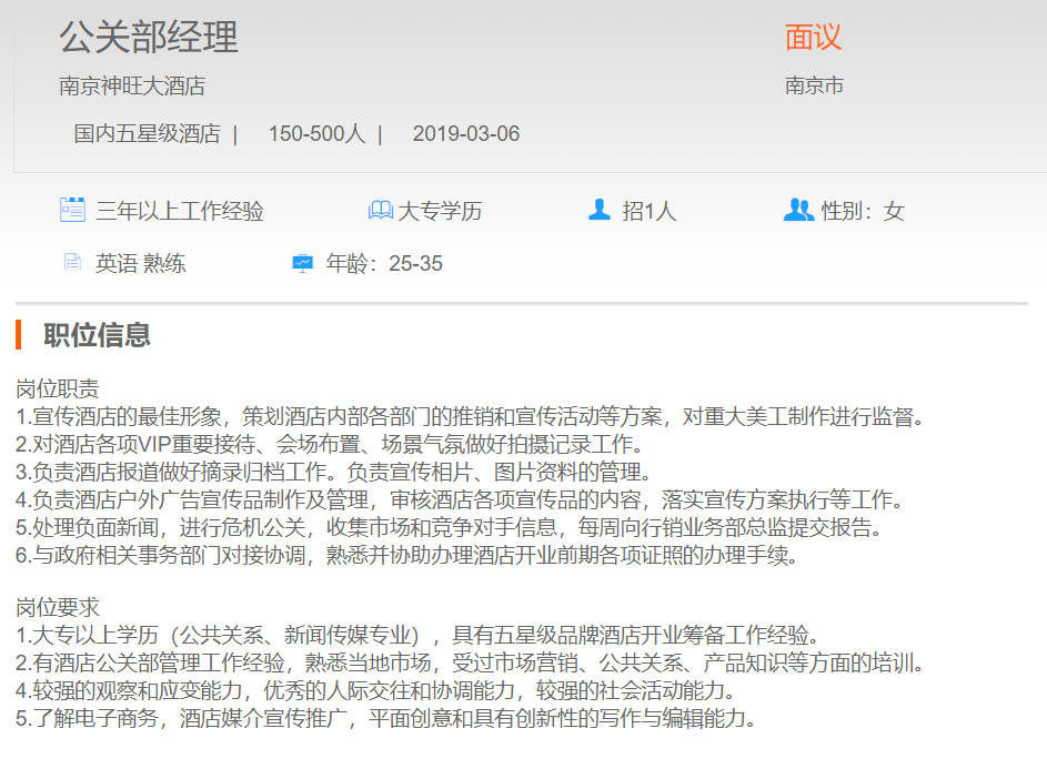 南京神旺大酒店公关部经理