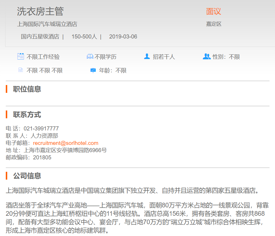 上海国际汽车城瑞立酒店洗衣房主管