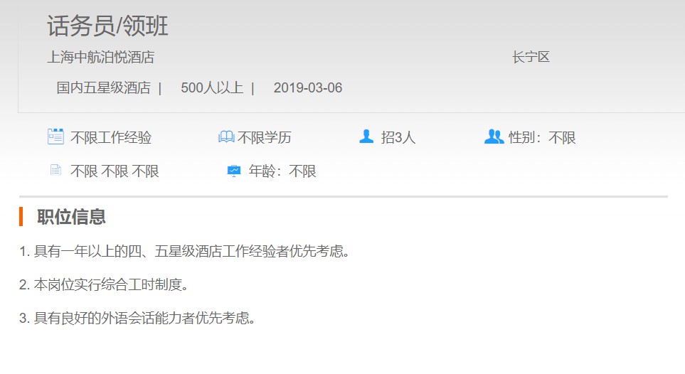 上海中航泊悦酒店话务员