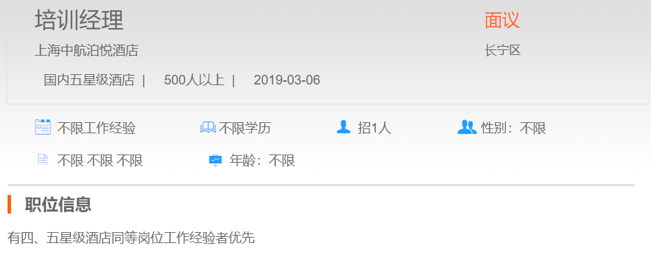 上海中航泊悦酒店培训经理