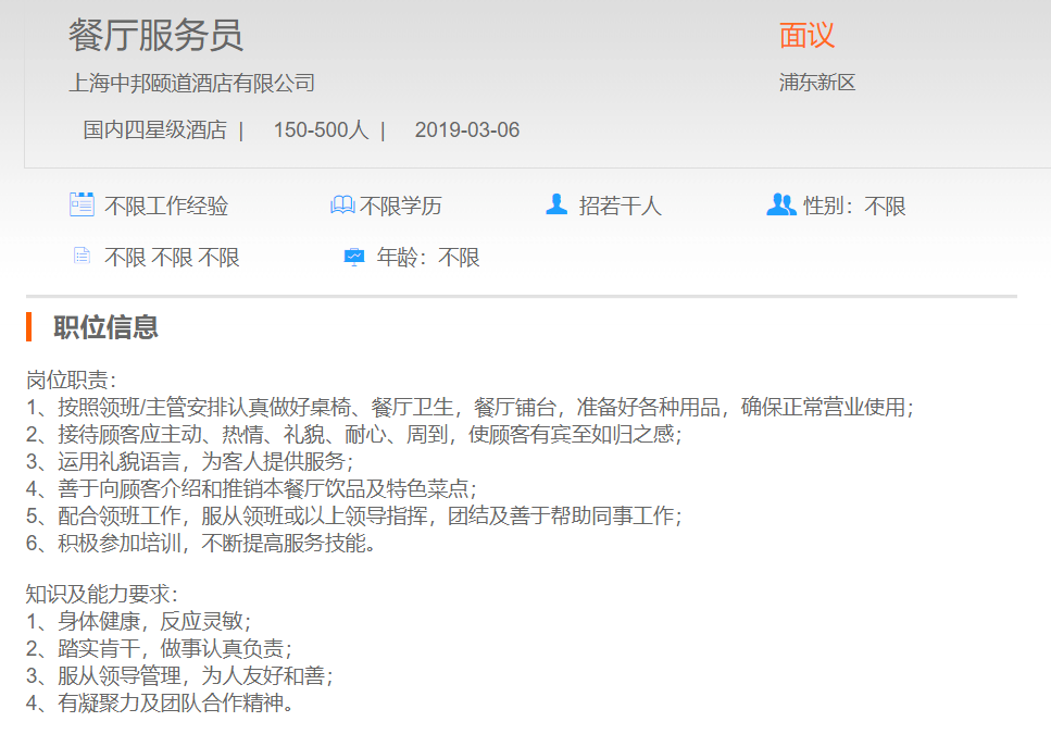 上海中邦颐道酒店有限公司餐厅服务员
