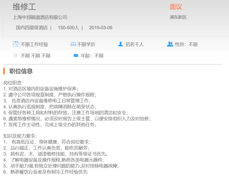 上海中邦颐道酒店有限公司维修工