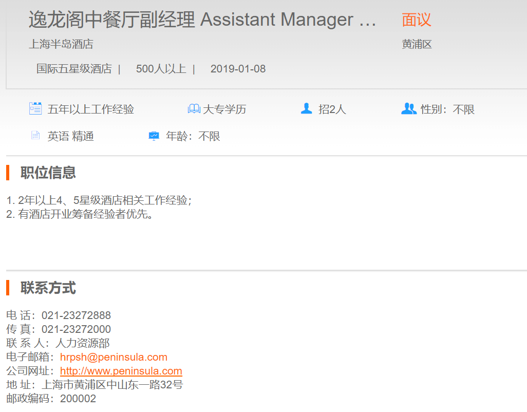 上海半岛酒店逸龙阁中餐厅副经理