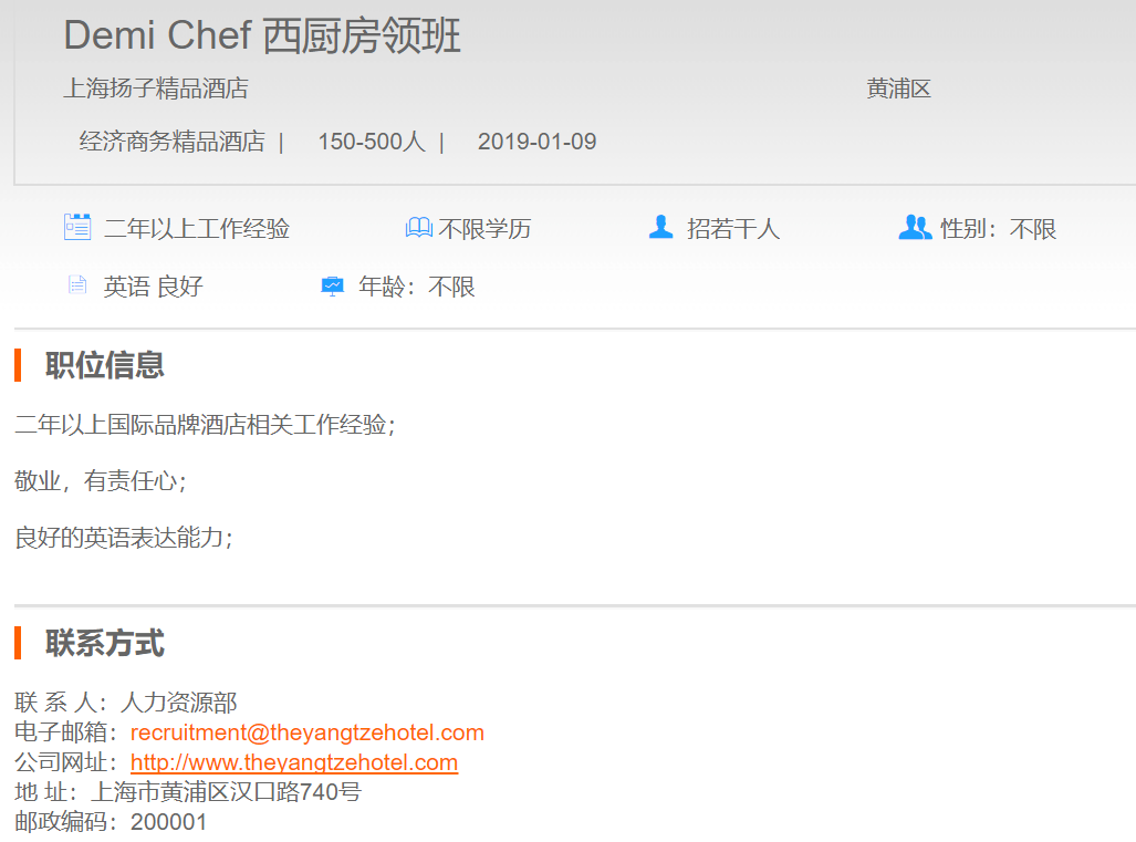 上海扬子精品酒店西厨房领班
