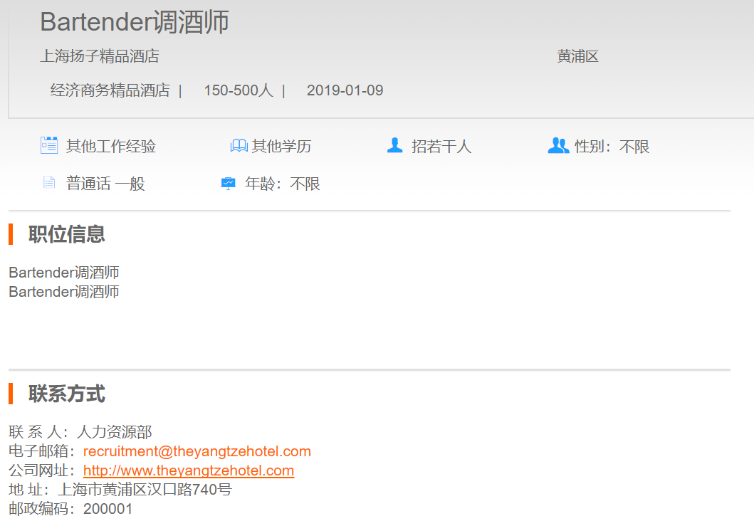 上海扬子精品酒店调酒师