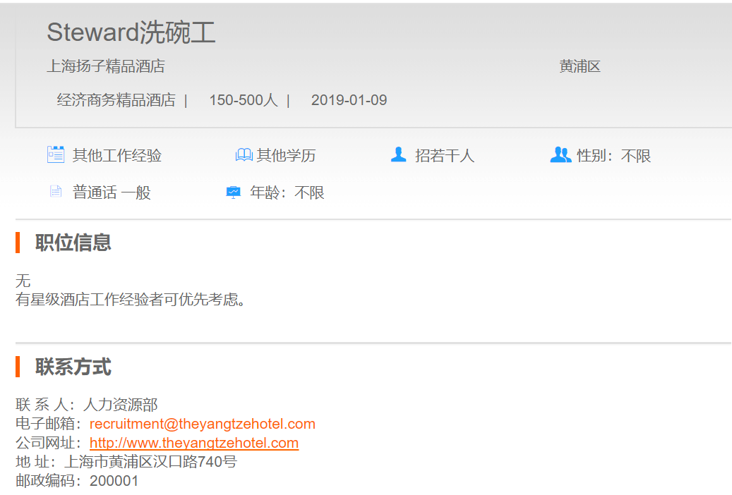 上海扬子精品酒店洗碗工