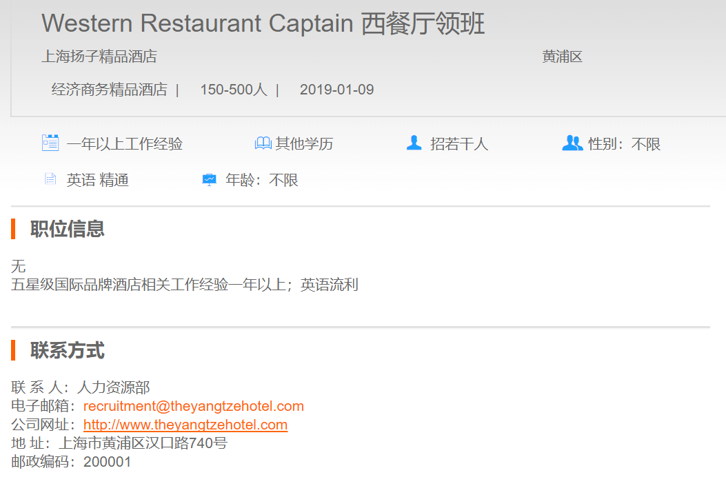上海扬子精品酒店西餐厅领班