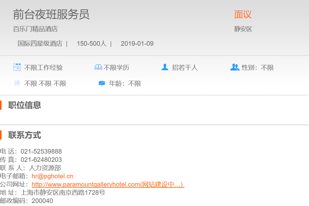百乐门精品酒店前台夜班服务员