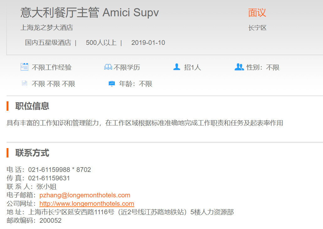 上海龙之梦大酒店意大利餐厅主管