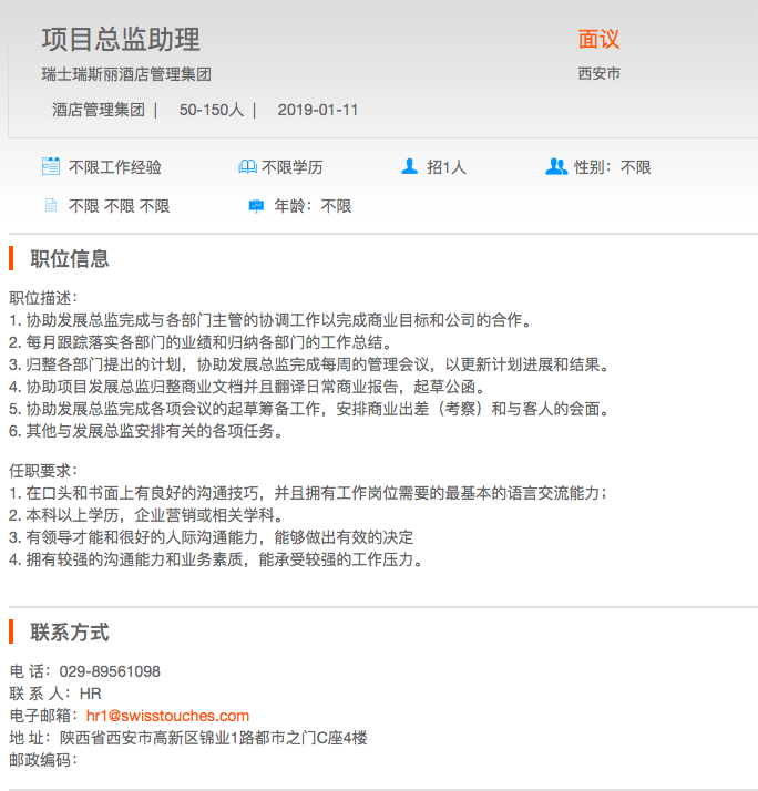 瑞士瑞斯丽酒店管理集团-项目总监助理