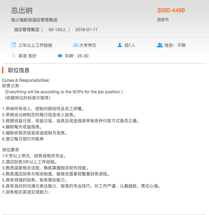 瑞士瑞斯丽酒店管理集团-总出纳