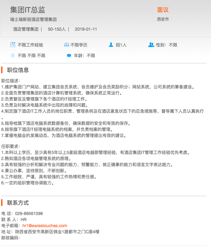 瑞士瑞斯丽酒店管理集团-集团IT总监