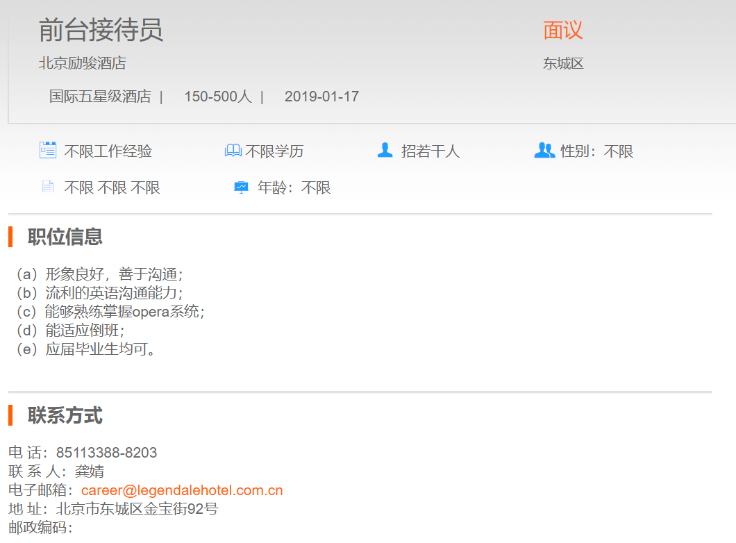 北京励骏酒店前台接待员