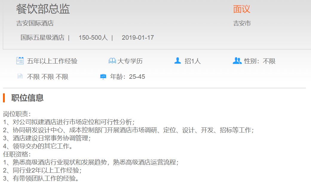 吉安国际酒店餐饮部总监