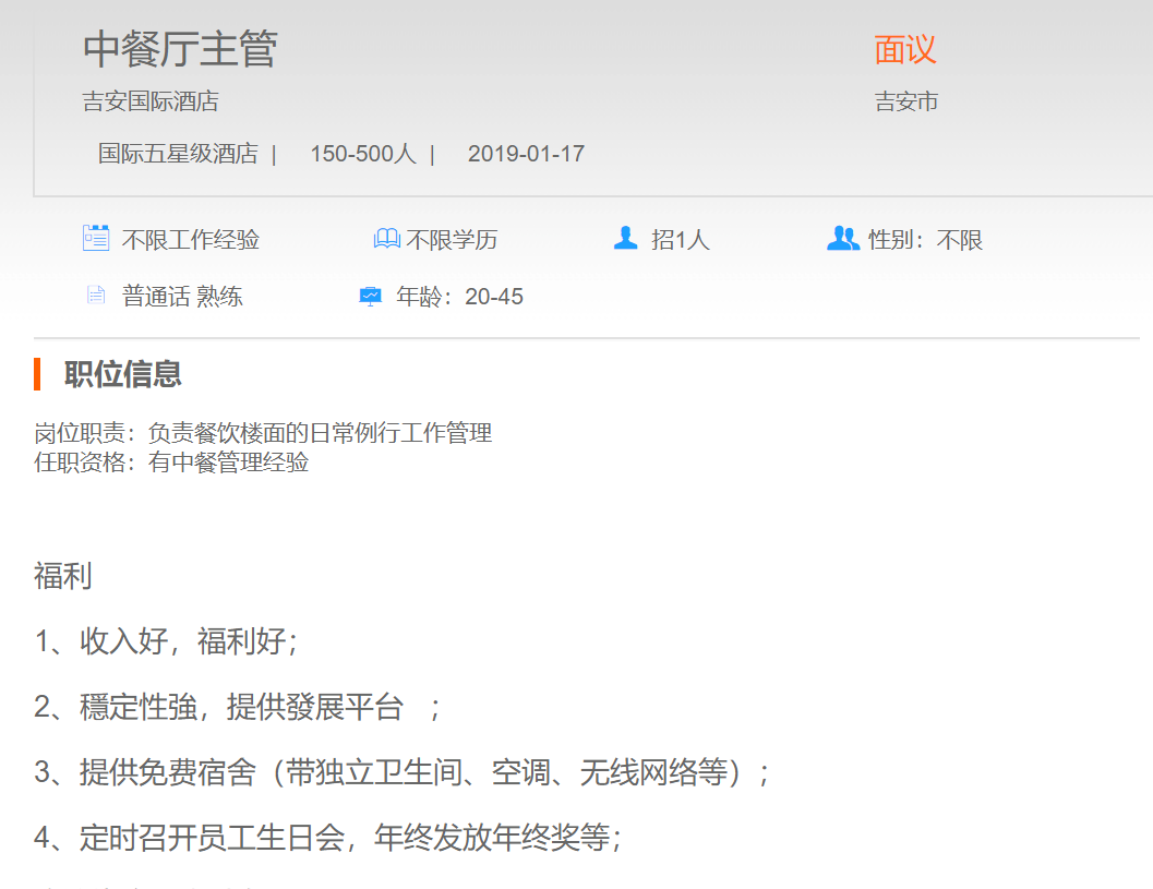 吉安国际酒店中餐厅主管