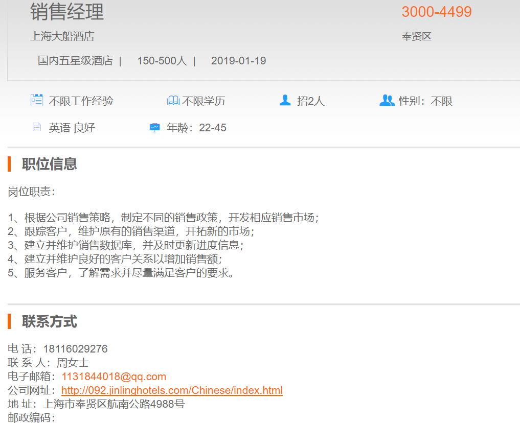 上海大船酒店销售经理