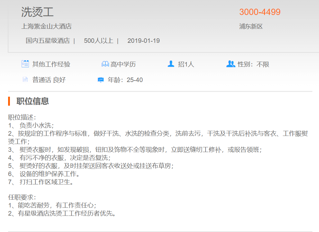 上海紫金山大酒店洗烫工