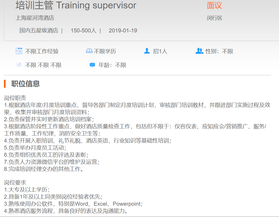 上海星河湾酒店培训主管