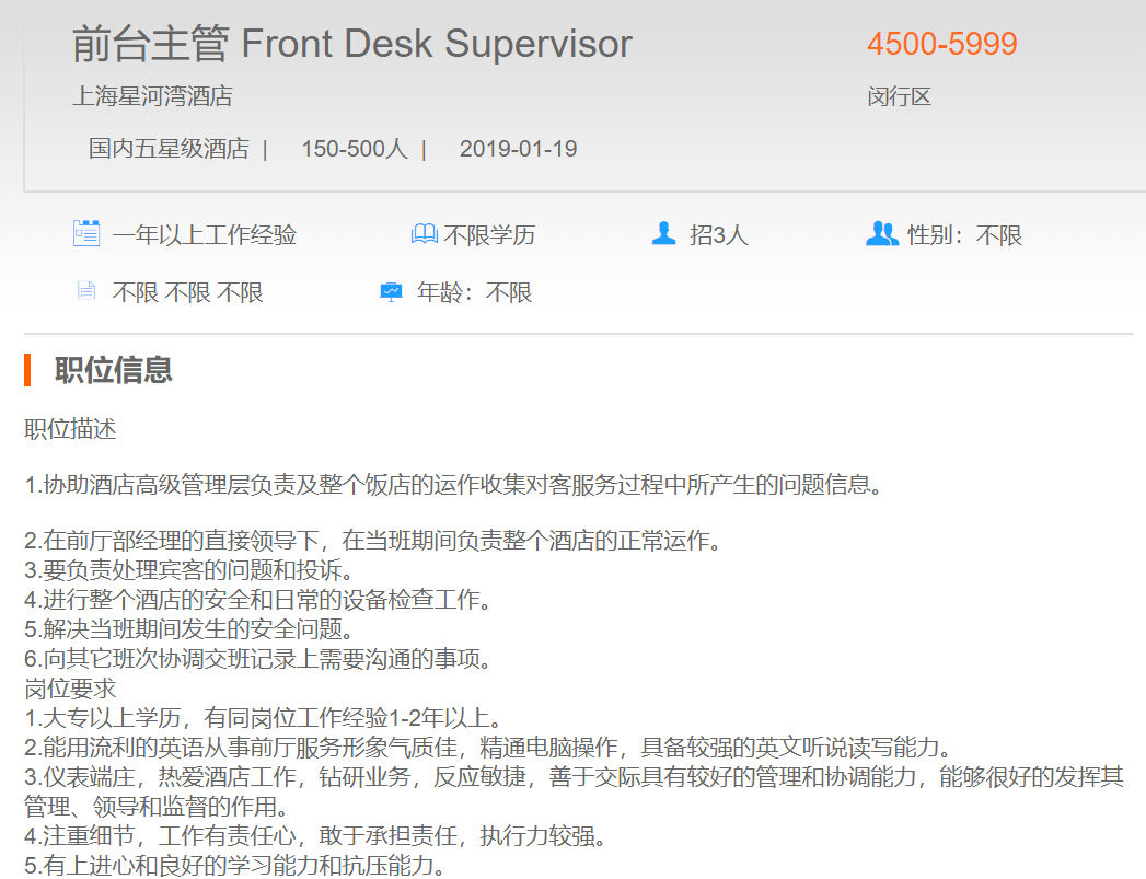 上海星河湾酒店前台主管