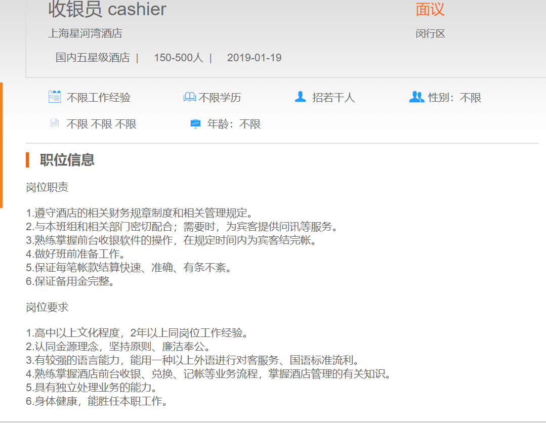 上海星河湾酒店收银员