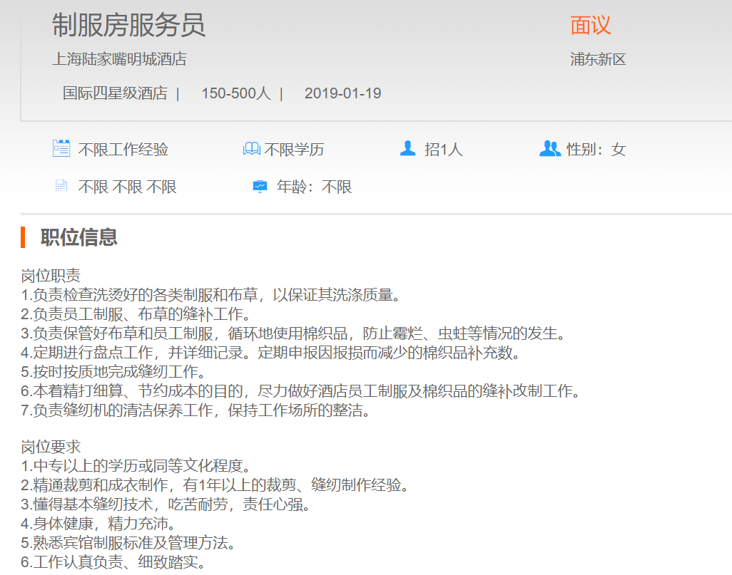 上海陆家嘴明城酒店制服房服务员