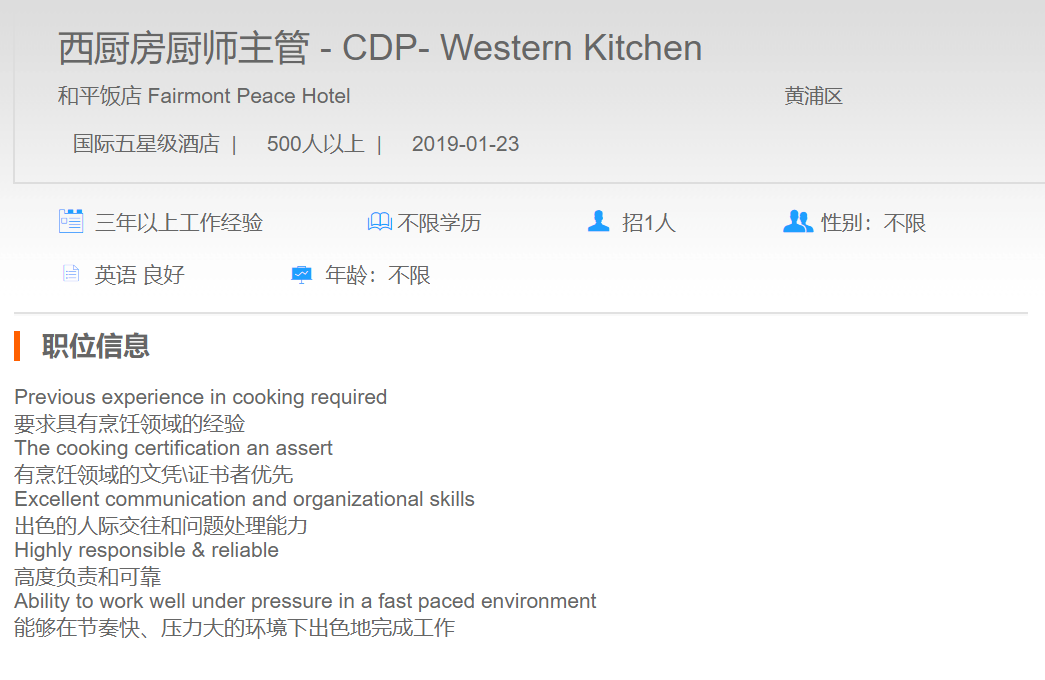 和平饭店西厨房厨师主管