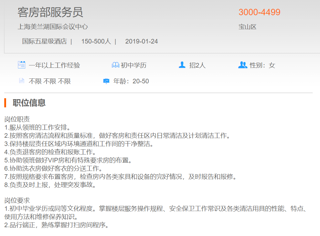 上海美兰湖高尔夫度假酒店客房部服务员