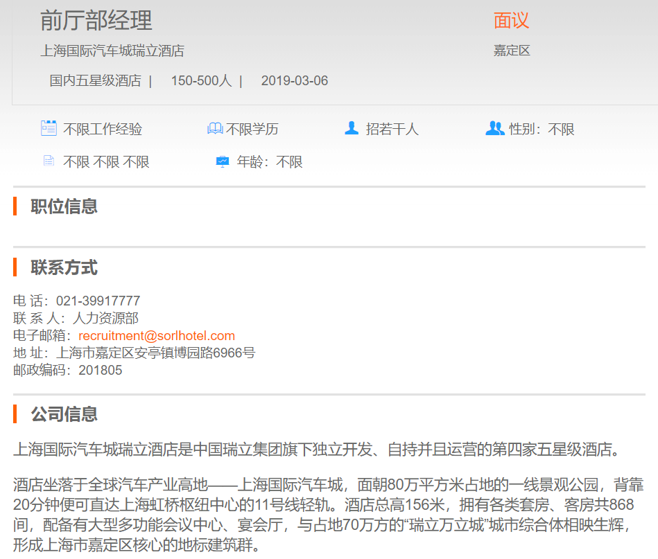 上海国际汽车城瑞立酒店前厅部经理