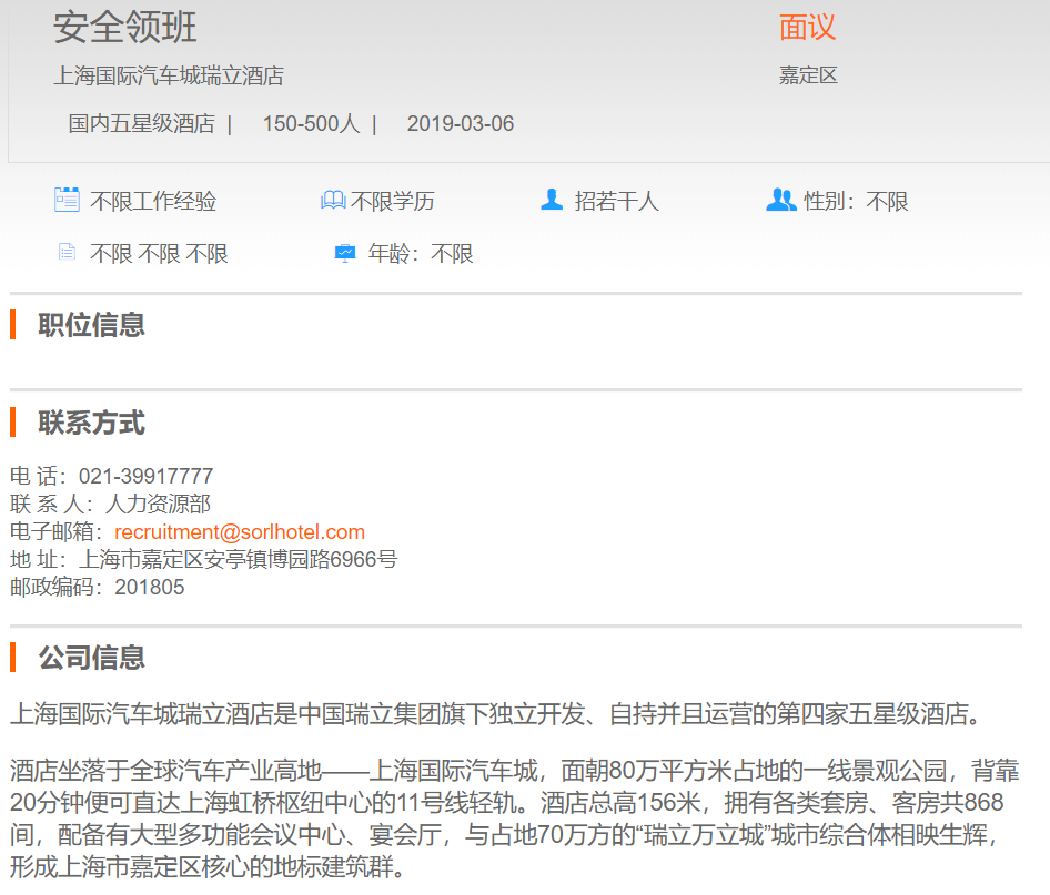 上海国际汽车城瑞立酒店安全领班