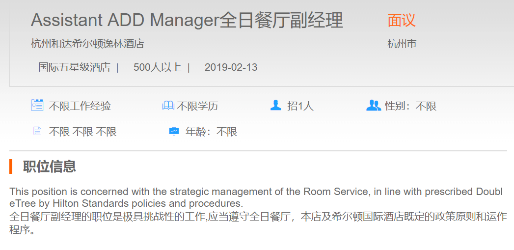 杭州和达希尔顿逸林酒店全日餐厅副经理