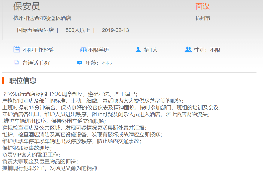 杭州和达希尔顿逸林酒店保安员