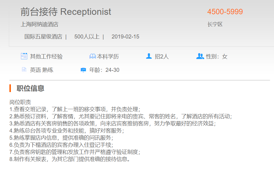 上海阿纳迪酒店前台接待