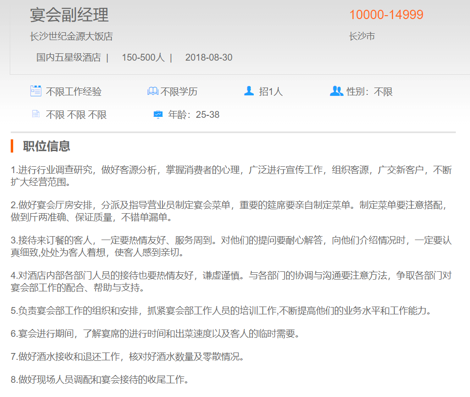 长沙世纪金源大饭店宴会副经理