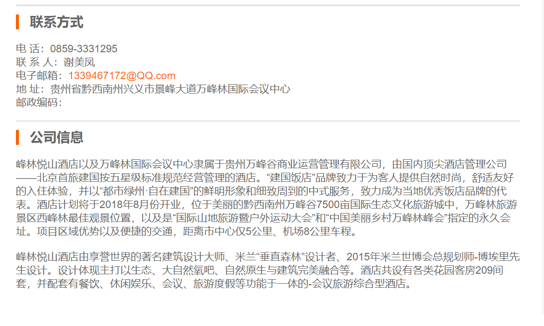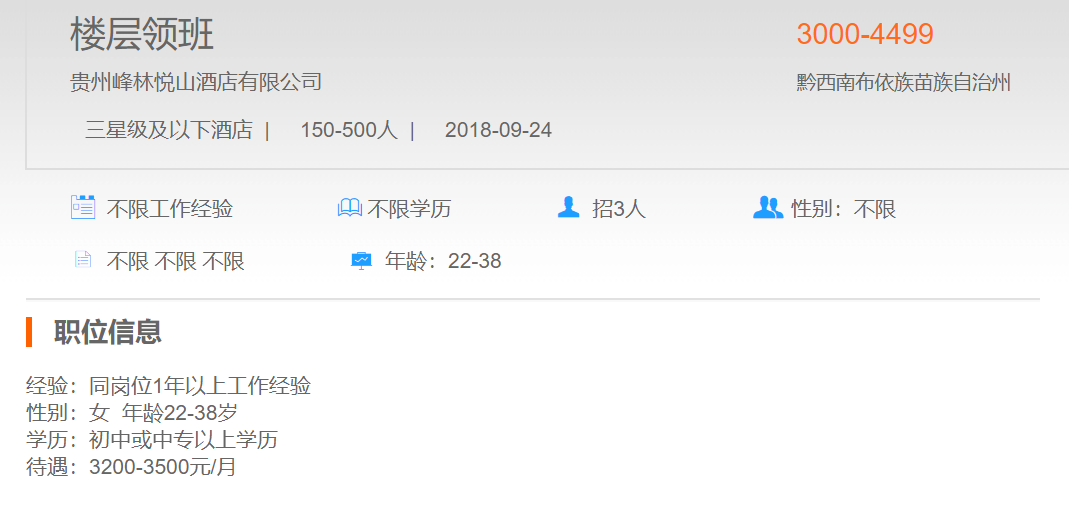 贵州峰林悦山酒店有限公司楼层领班