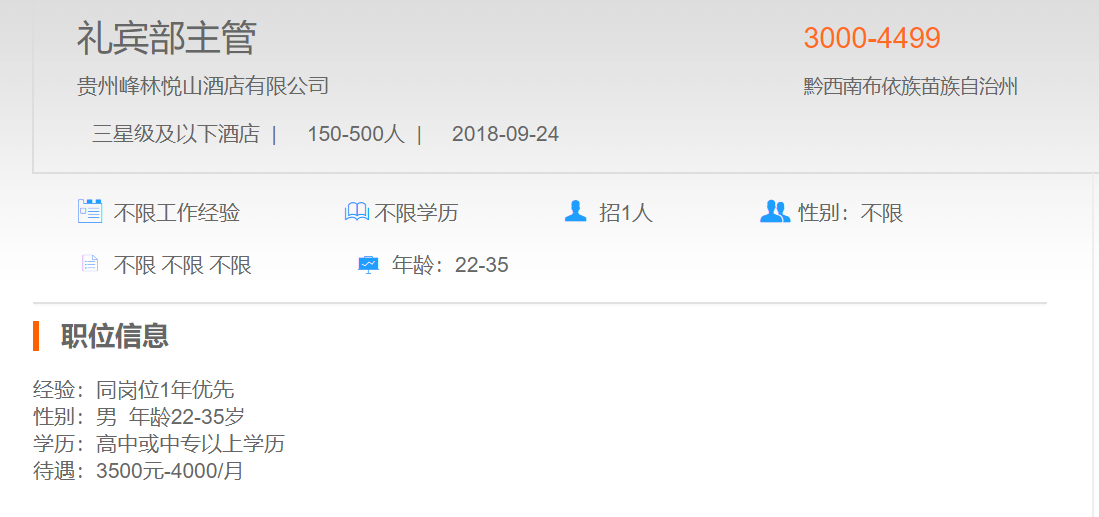 贵州峰林悦山酒店有限公司礼宾部主管