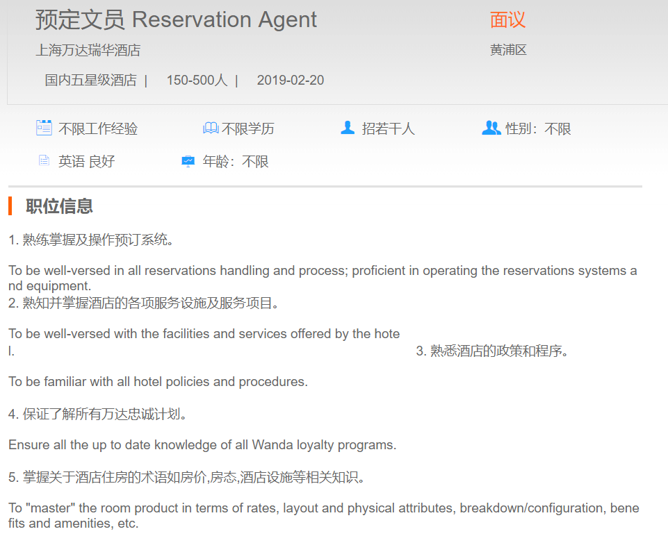 上海万达瑞华酒店预定文员