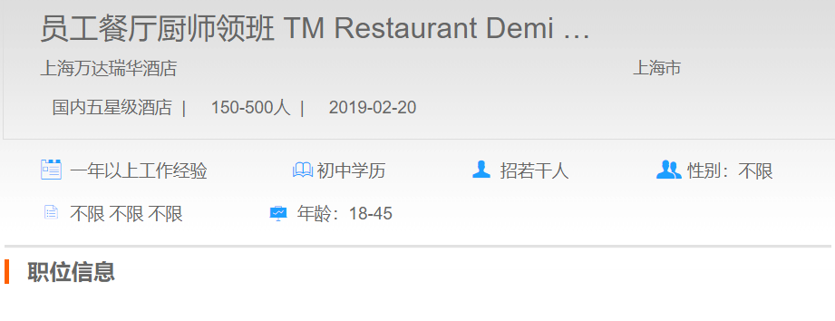 上海万达瑞华酒店员工餐厅厨师领班