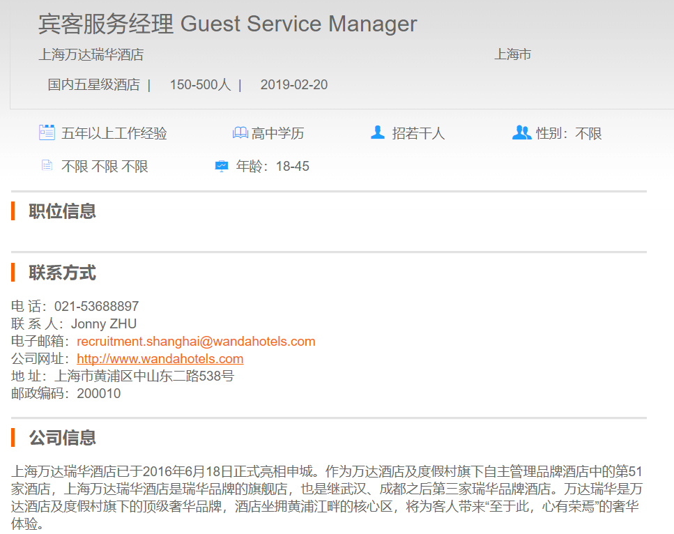 上海万达瑞华酒店宾客服务经理