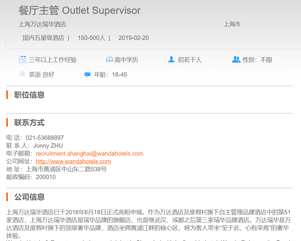 上海万达瑞华酒店餐厅主管