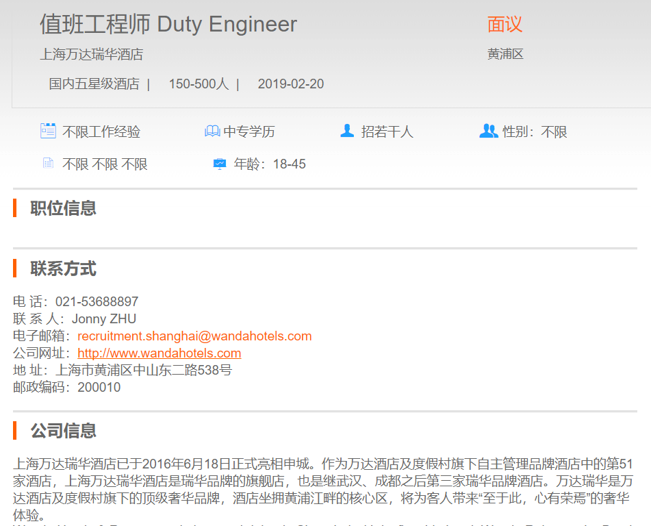上海万达瑞华酒店值班工程师