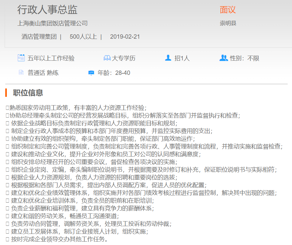 上海衡山集团饭店管理公司行政人事总监