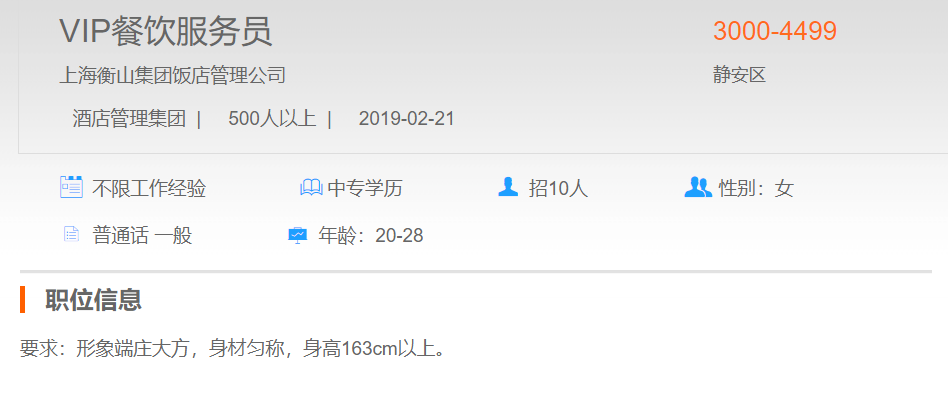 上海衡山集团饭店管理公司VIP餐饮服务员